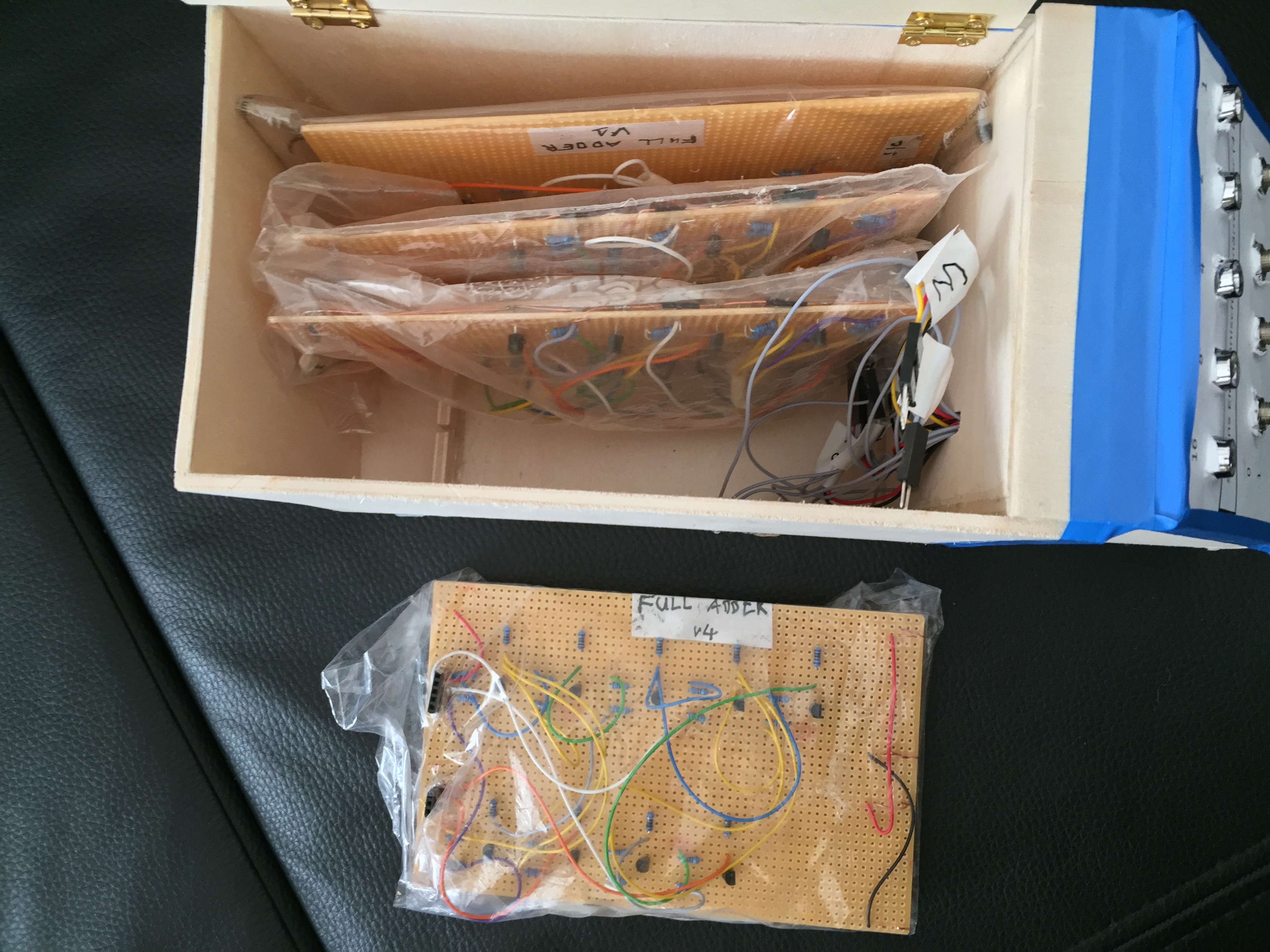 Top of calculator open to show three full-adders inside, and one pulled out for demonstration. I wrapped each adder in plastic to avoid pulling out cables.