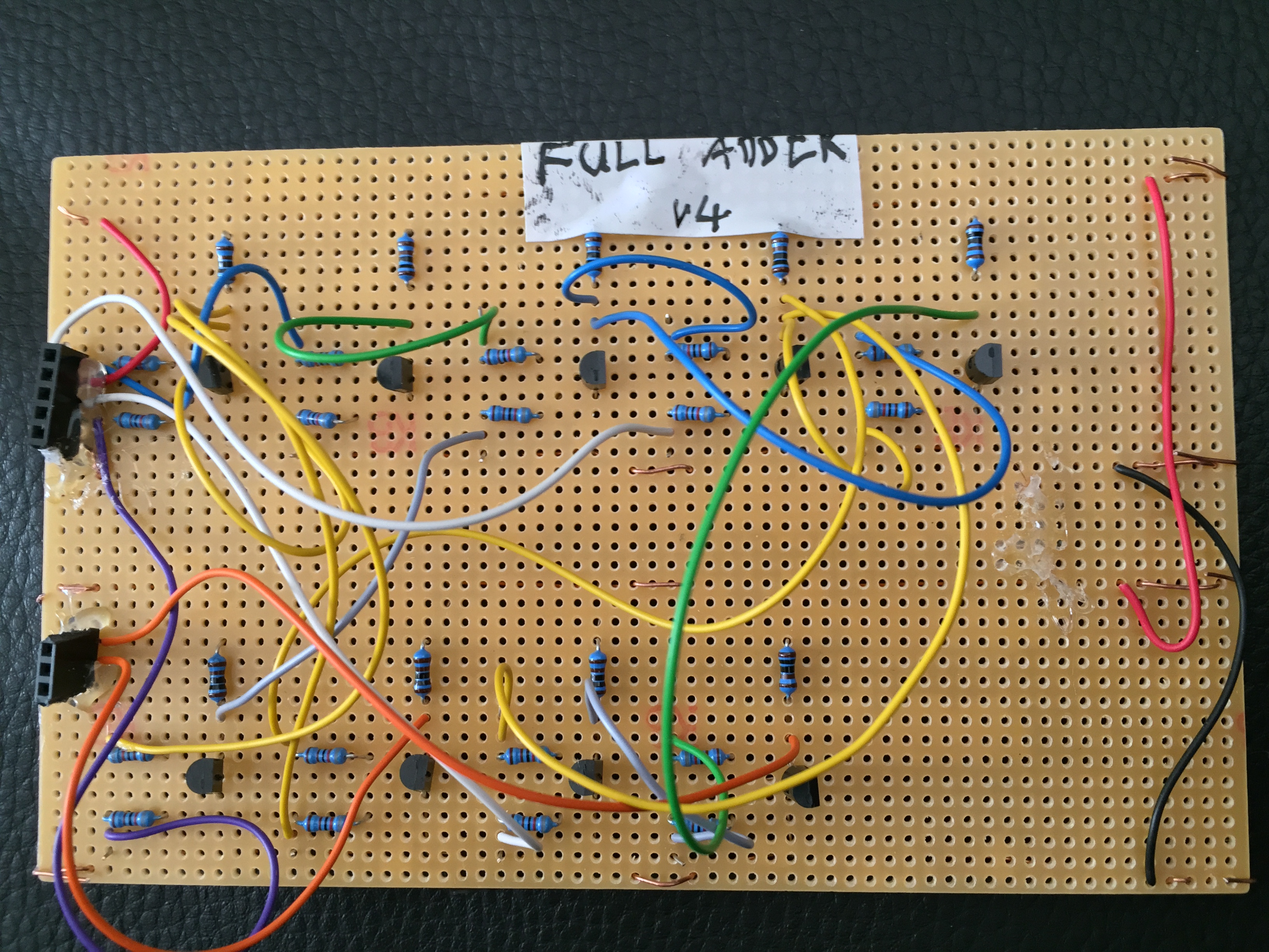 Seeing how he did this in 1938 on his kitchen table using bulky relais, I got the idea to use transistors to build my own electronic calculator for binary numbers. I found a great tutorial on how to build a 4-bit adder by WaitingForFriday. It helped me understand how to build the logic gates out of transistors. The full-adder used in WaitingForFriday's project is nice and easy to understand but requires 23 transistors for each adder. This is his full-adder design, which maps quite nicely to the actual boolean logic derived from the logic table. It's all very well explained in his post.