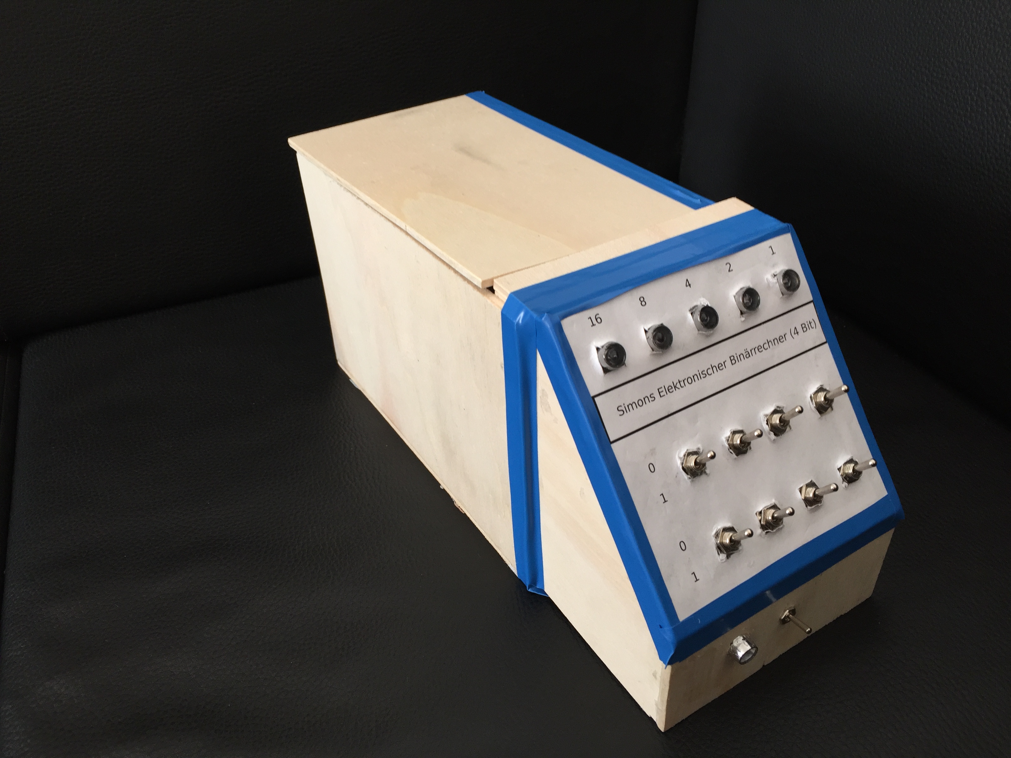 It took me about 90 minutes to place, wire and solder one full-adder and a few more hours to build the simple wood case and wire up the lights and switches. I thought about adding a 7-segment display to output the result in decimal but it turns out this would use more transistors then the whole adding machinery. And after all: why would you use a binary calculator if you can't read binary.