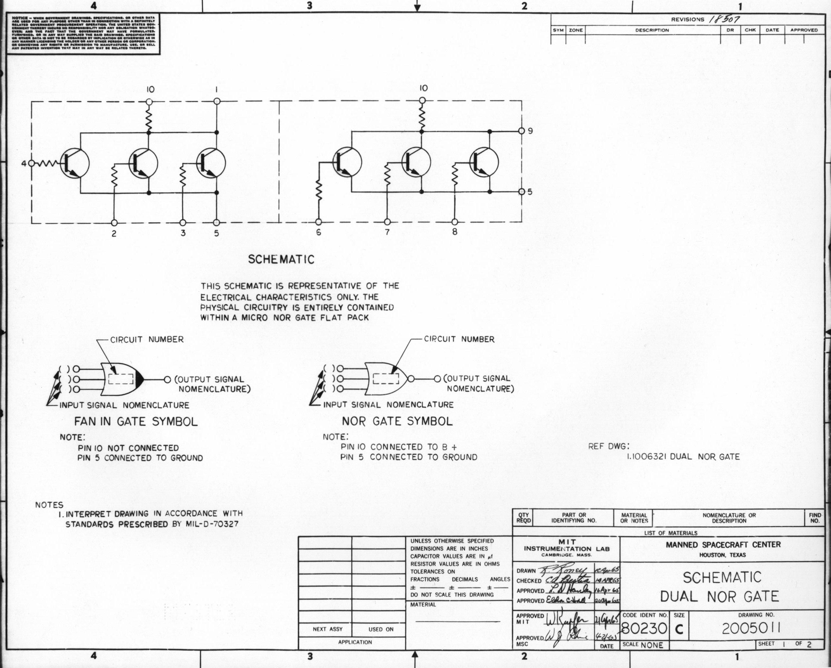 The trick of using NOR-gates to build up complex circuits isn't new. NASA used NOR-gates extensively for the Apollo computers in the 1960s as one of their integrated circuits. Here's a NASA design for their dual NOR-gate chip: